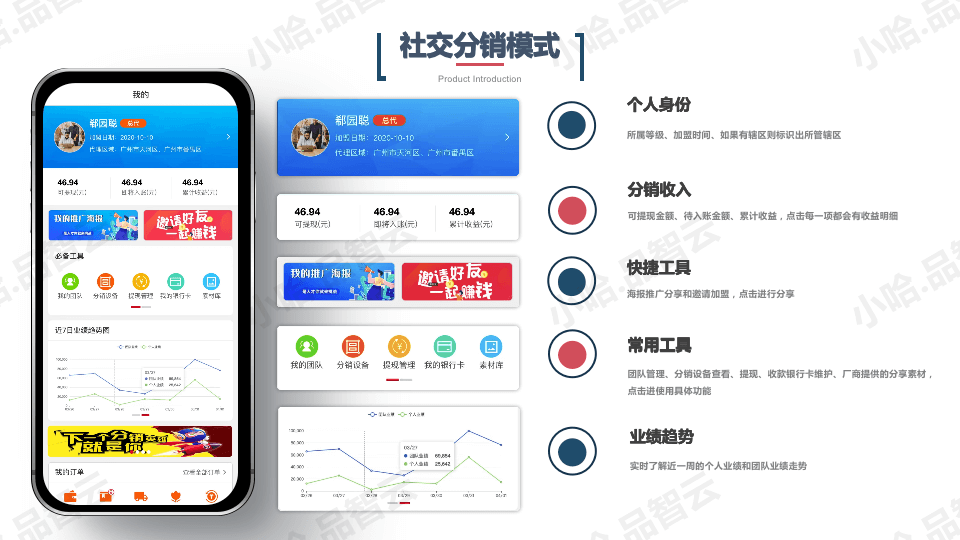 运营分销、社交分销、用户裂变等帮 您构建完整分销体系,佣金奖励/等级 刺激/推客分享等打造全⺠卖货。